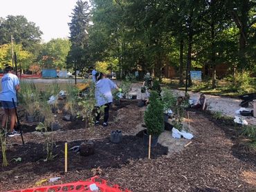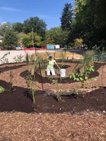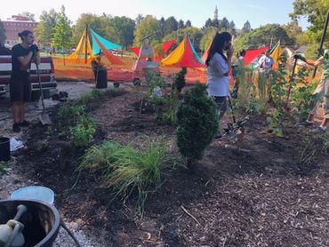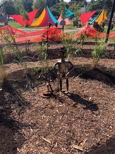 The A-Mazing Garden designed by Kris Prengaman is a delightful maze for all! Crafted with wildflowers and tall grass donations from the community, the garden grows tall in warmer months concealing the maze and a metal sculpture called Joey the Muffler Boy and his Dog. Enjoy the story on pavers as you travel through!