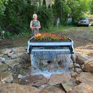 Description: A repurposed baby grand piano water feature with a small garden on top and a rushing “waterfall” over the keys. The piece is nestled amongst a rock garden, with rocks of varying size and kind.