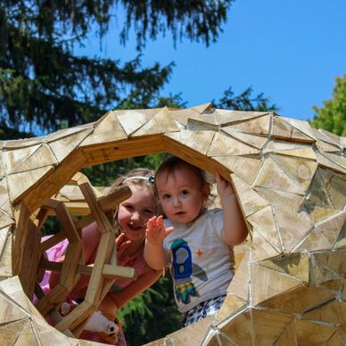 Activity: Climb the back or front of the owl to make your way to the top to have a bird's eye view of the Imagination Space. A movable ship style wheel is at the top.