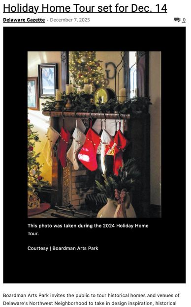 "On Sunday, Dec. 14, from 2-6 p.m., nine historical stops in the Northwest Neighborhood will show off their festive spirit during a self guided tour hosted by Boardman Arts Park and sponsored by Wilcox Communities."