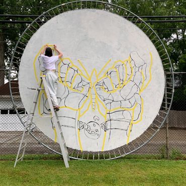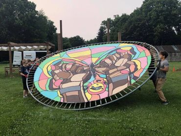 Created on a repurposed trampoline and positioned in the heart of Delaware at the Boardman Arts Park, Project Freedom is a colorful and meaningful piece to attract, educate, comfort and inspire the community at large. From afar, onlookers will see a mosaic butterfly created with a multitude of bright and neutral colors. Close up it will become evident that tucked within the iconic image of metamorphosis, positivity, and change are two fists breaking free from the chains which bind them.